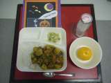 本日の献立は「牛肉と野菜のケチャップソテー・スープ・スイートポテト・パン・牛乳」...