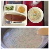 本日の献立は「コーンクリームシチュー・キャベツと三度豆のサラダ・かき(富有柿)・...