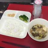 本日の献立は「豚肉のねぎだれかけ・さといもと野菜の煮もの・ツナっ葉いため・ごはん...