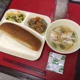 本日の献立は「豚肉とごぼうの煮もの・なにわうどん・キャベツと三度豆のごまあえ・パ...