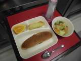 本日の献立は「牛肉のデミグラスソース煮・コーンスープ・かぼちゃのプリン・パン・牛...