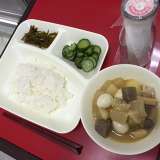 本日の献立は「関東煮・あっさりきゅうり・茎わかめのつくだ煮・ごはん・牛乳」でした...