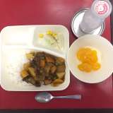 本日の献立は「ハヤシライス・カリフラワーとコーンのピクルス・みかん(缶)・牛乳」...