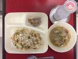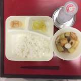 本日の献立は「中華おこわ・鶏肉とあつあげのうま煮・きゅうりとコーンの甘酢あえ・パ...