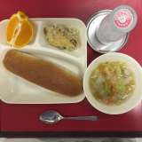 本日の献立は「押し麦のグラタン・スープ・デコポン・パン・牛乳」でした。 押し麦の...