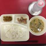 本日の献立は「えびとチンゲンサイのいためもの・中華がゆ・はっさく・パン・牛乳」で...