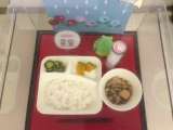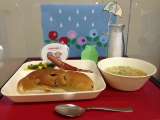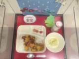 本日の献立は「鶏肉と野菜のスープ煮・カレーソテー・ミックスフルーツのクラフティ・...