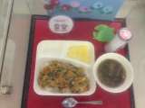 本日の献立は「マーボーはるさめ・チンゲンサイとコーンの甘酢あえ・びわ・ごはん・牛...