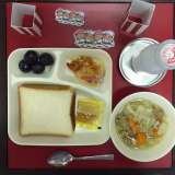 本日の献立は「鶏肉とてぼ豆のスープ煮・じゃがいもとトマトの重ね焼き・ぶどう(巨峰...