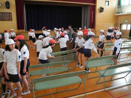 明日は茨田小学校で、鶴見区内のすべての先生方が集まる会議があります。4月16日の昼休み、6年生は講堂に椅子を並べてくれました。列をまっすぐにそろえて、とても気持ちがいいです。