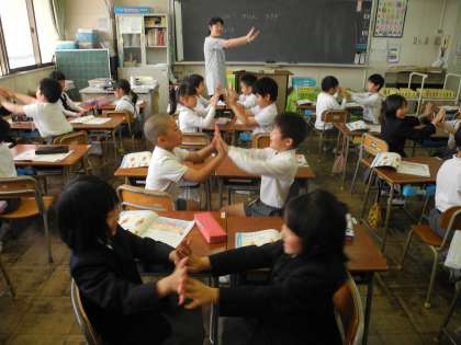 4月22日 2時間目。6年2組はウィック先生の英語。2年1組は音楽。「はしの上で」の曲に合わせて手遊びをしていました。4年2組は社会科。焼却工場のしくみの学習です。