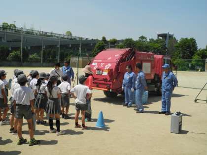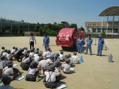 4年生の社会科の学習のため、学校にパッカー車がきました。お話を聞いたり、自分の持ってきたゴミをパッカー車に入れたりしました。