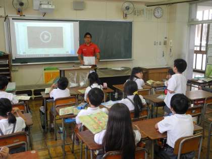 今年度、英語の学習の時間に、茨田中学校の森本先生に来ていただき、教えていただいています。森本先生の授業は全部英語!子どもたちは一生懸命に聞き取ろうとしています。