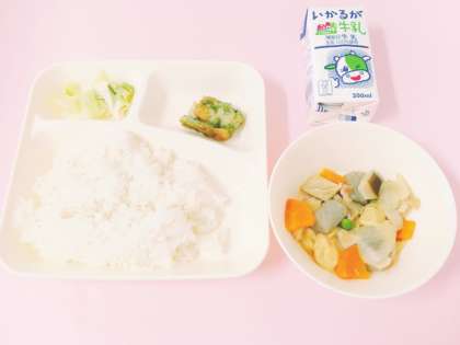 【ちくわのいそべあげ、鶏肉と一口がんもの煮もの、あっさりキャベツ、ごはん、牛乳】