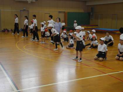 6月7日 2時間目、1年生が講堂で体育の学習をしていました。職場体験に来た中学生がやさしく手伝ってくれていました。