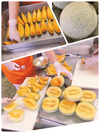 まず1個を半分に切り、種をくりぬきます。そして、半分を4等分にします。1個のメロンで8等分。そして、食べやすいように切り込みを入れてくださり、1つ1つ食缶にくずれないように入れていきます。