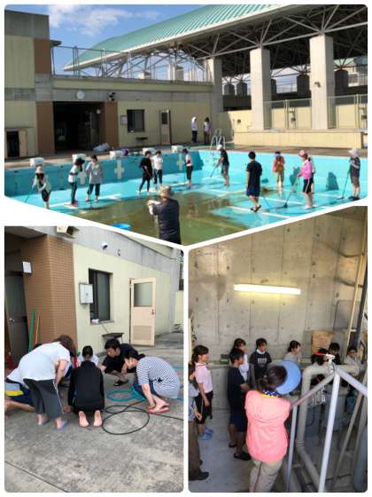 プール開きを前に、先生たちが協力してプール清掃やプール備品の準備を行いました。