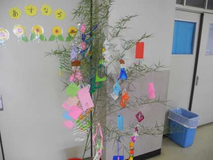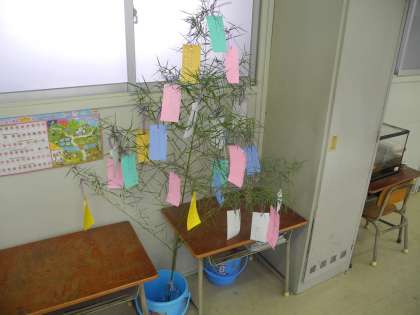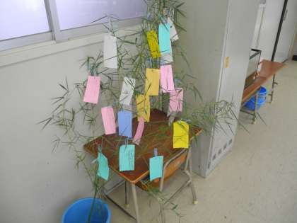 1年生とあすなろ学級の前に七夕の笹が飾ってありました。短冊に、かわいいお願いが書いてありました。