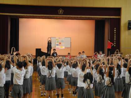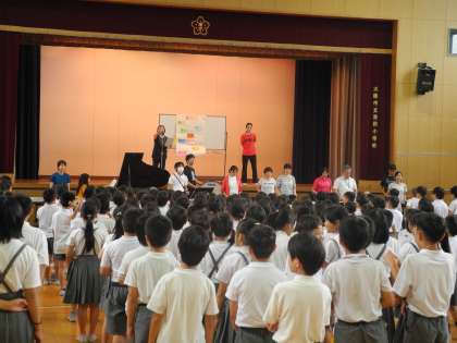 7月4日、音楽集会で「ドレミの歌」と「赤いやねの家」を歌いました。「ドレミの歌」では体の部位をさわりながら歌います。先生たちの伴奏にあわせて歌い、楽しい集会になりました。