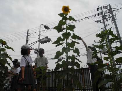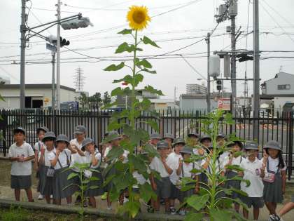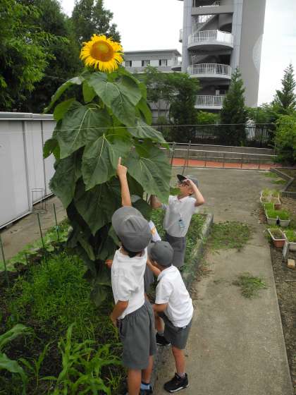 あすなろと1年生の学習園のヒマワリが、ぐんぐん育っています。子どもたちと比べると、その大きさは一目瞭然!
