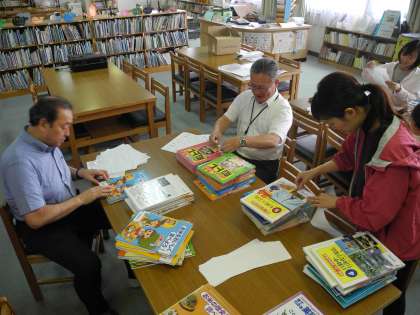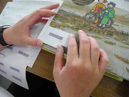 本校では図書室の本のバーコード化を進めています。バーコード化することで本の貸し出しが正確に行われます。懇談会の間、担任ではない教職員が一冊一冊にシールを貼ってパソコンに入力していきます。しかし、図書室の本は7000冊以上!貼っても貼っても終わりません。