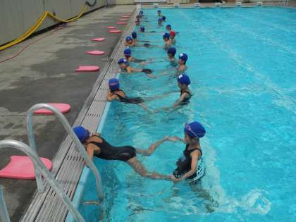7月12日 4時間目、4年生がプール水泳の学習をしていました。平泳ぎの足の動きがむずかしく、ペアになって練習していました。