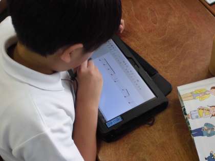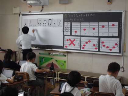 今日はひとり一台のタブレット端末を使った授業でした。「ミソラドレの5つの音」をつかってお囃子をつくりました。