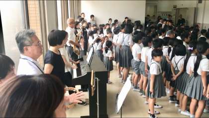 調理員さんへ今までの感謝をこめて、「ありがとうの花」を振りつきで歌います。演奏隊は、校長先生、教頭先生、教務の先生、養護教諭、事務の先生、栄養教諭です。朝の集会で、先生にご指導いただき、練習もしました!