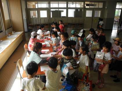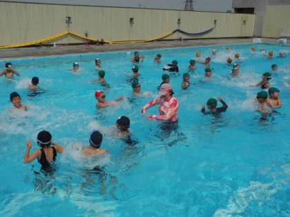 7月23日、今日は晴天に恵まれ、夏休みのプール開放が始まりました。違う学年の子どもたちが一緒に楽しく遊んでいました。