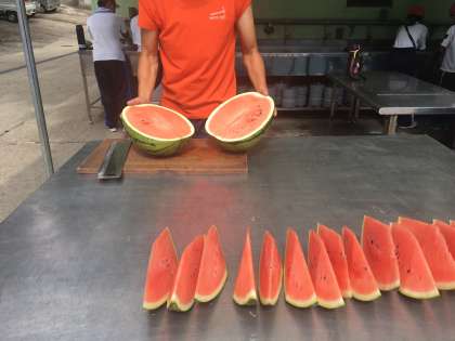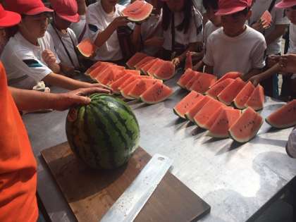 3時のおやつは山のスイカでした!おっきくてとっても甘かったです。みんなで一列に並んで食べました。