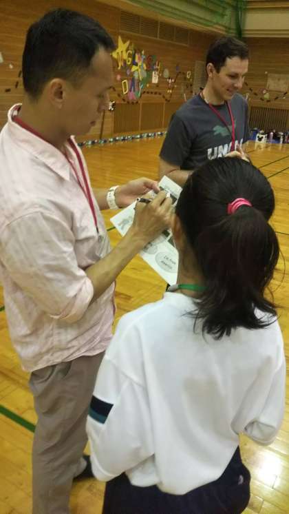 約120名のC-NET(大阪市立の学校に勤務する英語ネイティブスピーカー)と交流し、集中的に英語を使う活動を体験しました。