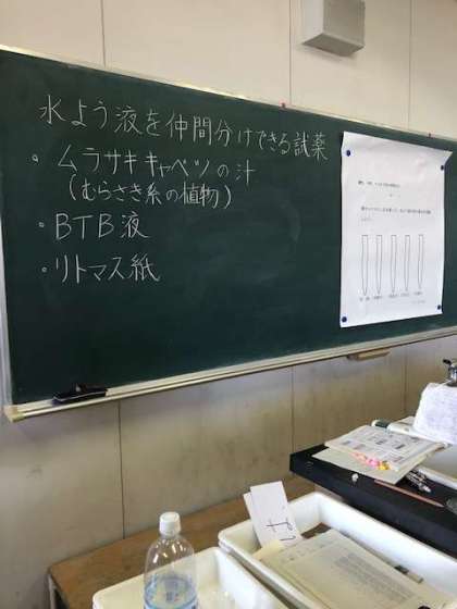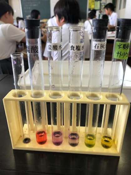 6年生はリトマス試験紙を用いて、水溶液は酸性、中性、アルカリ性の3つの性質に分けられることを学習しました。今日の学習はムラサキキャベツの汁を試薬として使い、いろいろな水溶液の色の変化を観察しました。