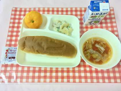 【豆乳マカロニグラタン[米粉]、トマトスープ、みかん(冷)、大型コッペパン、牛乳】
