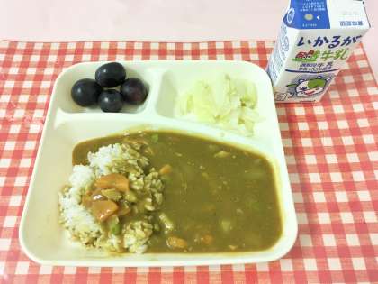 【チキンカレーライス[米粉]、キャベツのピクルス、ぶどう(巨峰)】