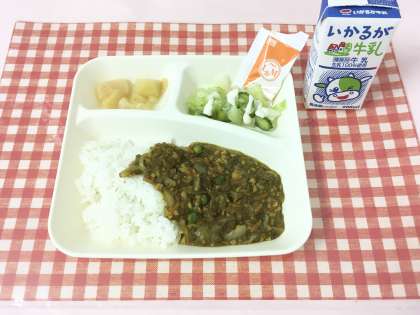 【大豆入りキーマカレーライス〔米粉〕、グリーンサラダ〔ノンエッグドレッシング〕、白桃(カット缶)】