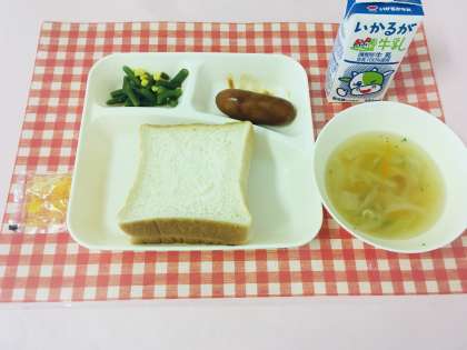 【フランクフルトのケチャップソース、スープ、さんどまめとコーンのサラダ、食パン、マーマレード】