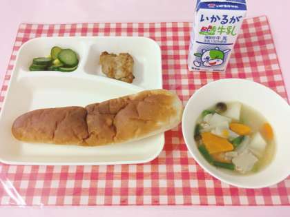 【鶏肉のみそマリネ焼き〔ノンエッグドレッシング〕、スープ煮、きゅうりとコーンのサラダ、おさつパン、牛乳】