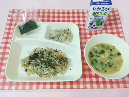 【牛肉のきんぴらちらし、みそ汁、キャベツの赤じそあえ、牛乳】