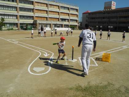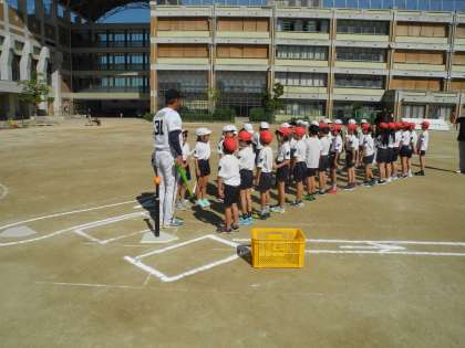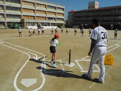 オリックスバッファローズのみなさんにお越しいただき、ティーボール野球を教えていただきました。野球を知らない子でも楽しく参加できるように、やさしく教えていただきました。