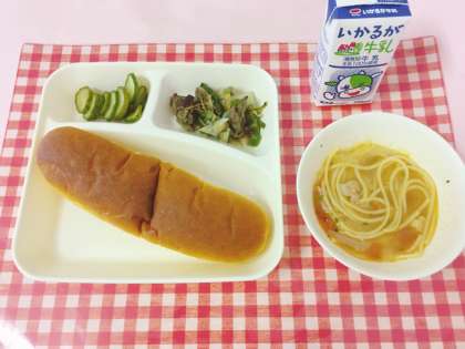 【牛肉のカレー風味焼き、トマトのスープスパゲッティ、きゅうりのピクルス、パンプキンパン、牛乳】