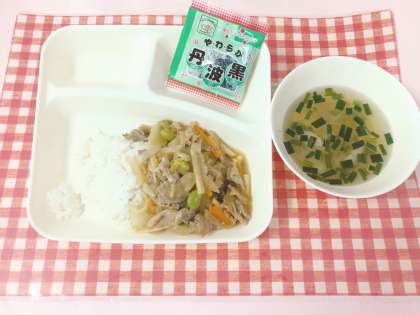 【ピリ辛丼、中華スープ、ソフト黒豆、牛乳】