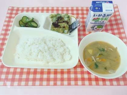 【ごはん、お好み焼き、豚汁、きゅうりの甘酢あえ、牛乳】