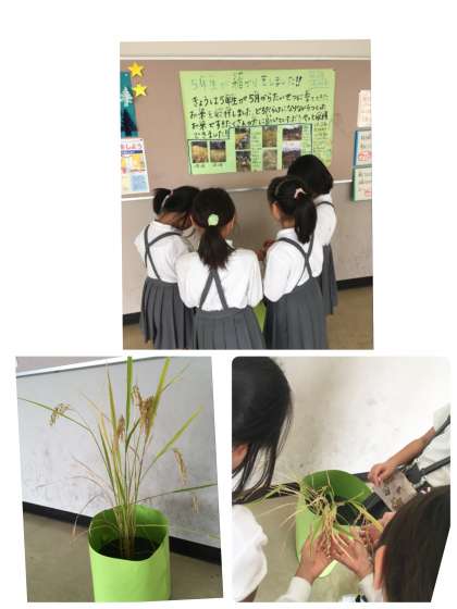 茨田小学校には田んぼがあり、5年生になるとお米づくりに挑戦します!今日は稲刈りの日だったので、その様子を写真にとって給食室前に掲示しました!本物の稲も一緒に展示すると、みんな興味深々で、そっと触って、見入っていました。品種は、ヒノヒカリです!お茶碗一杯の米は、なんと、約3250粒あるんだよ!と言うと、「えーーー!!」とみんな目を丸くして、驚いていました!!