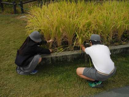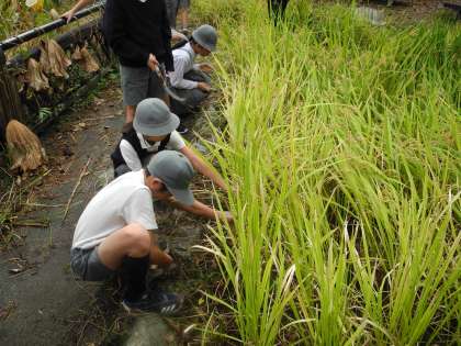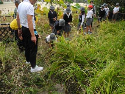 10月18日、地域の皆さんに手伝っていただいて、5年生が稲刈りをしました。田植えの時に小さな苗だった稲が立派に成長しました。