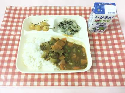 【ハヤシライス【米粉】、キャベツのひじきドレッシング、さくらんぼ(缶)、牛乳】