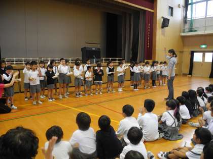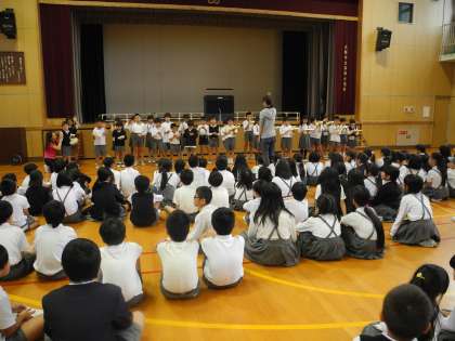 給食後の休み時間にランチタイムコンサートをしました。今日は2年2組の発表です。昨日練習した「山のポルカ」を歌ったり合奏したりしました。