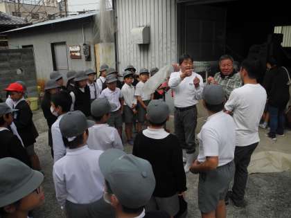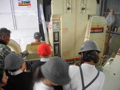 脱穀した もみを持って学校のとなりの「堤中さん」のおうちへ行きました。もみすりの機械に入れると玄米の出来上がりです。学校の中で脱穀したり、近くでもみすりしたりと、子どもたちはとても良い体験ができました。
