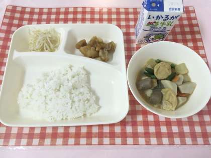 【ごはん、あげどりのねぎだれかけ、含め煮、もやしのゆずの香あえ、牛乳】