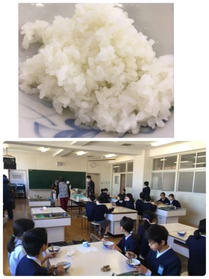 家庭科室では、5年2組さんが今年、自分達で作ったお米を炊いて、炊きたてご飯をいただく授業をしていました!!お世話になった農家の方がいろいろなお話しをしてくださいました。自分達で育てたお米は、つやつやふっくらご飯に炊きあがりました!一口食べては、「美味しい—♪」とニコニコ笑顔がいっぱいでしたよ!おこげも残さず大切に食べました!