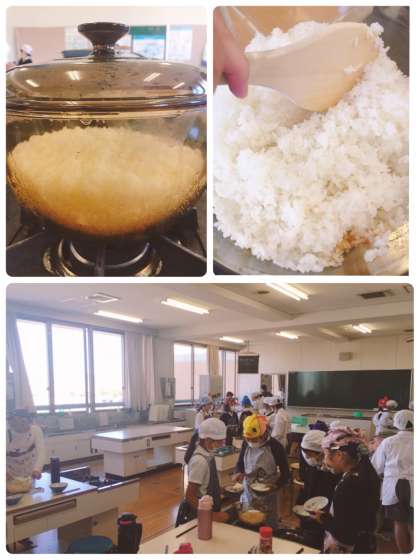 5時間目、5年1組さんも家庭科室で、自分たちで育てた、お米を炊きました!!鍋で炊きます。火をつけてから、みんな炊けるまで、待ちきれなくて、テンションがあがります。いよいよ、お鍋の蓋をあけます!あちこちから、わーー♪という歓声があがり、お茶碗によそう時も、ニコニコ笑顔です!2組さん同様、みんな、その美味しさに感動していましたよ!